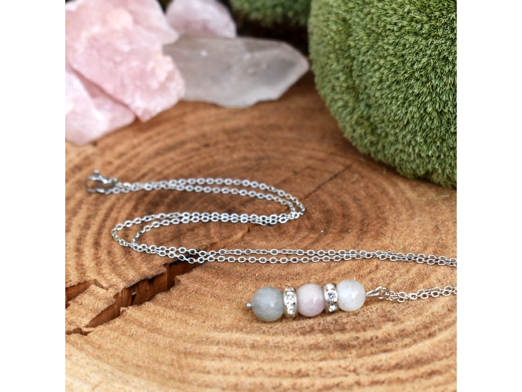Tato souprava šperků je vyrobena z přírodního kunzitu, labradoritu a bílého měsíčního kamene. Průměr kamínků je 8 a 6 mm. Kokové korálky se skleněnými zirkony jsou vyrobeny z chirurgické oceli s označením 316 L. Náramek je proto vhodný i pro alergiky. Co je chirurgická ocel 316L?
