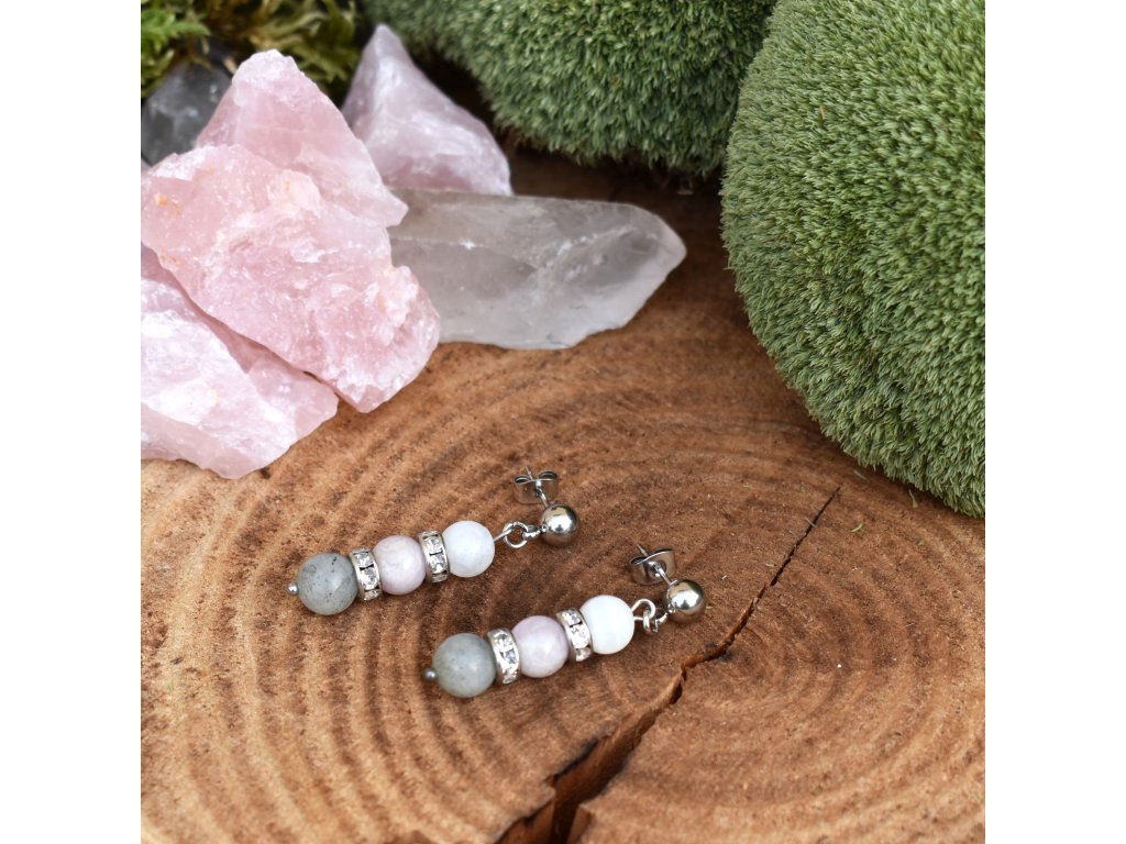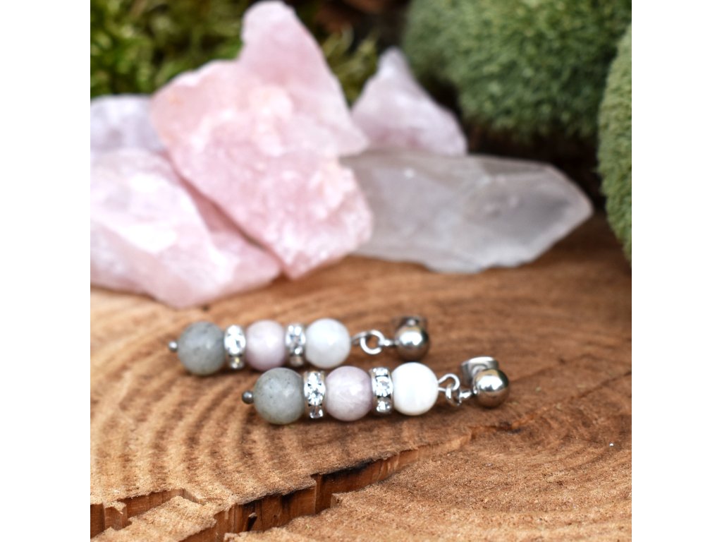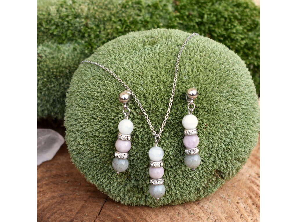 Souprava náušnic a náhrdelníku z minerálů SEBEDŮVĚRA – kunzit, labradorit, bílý měsíční kámen, chirurgická ocel