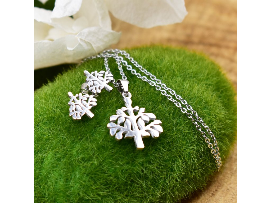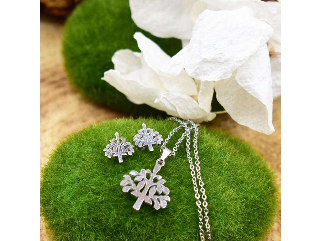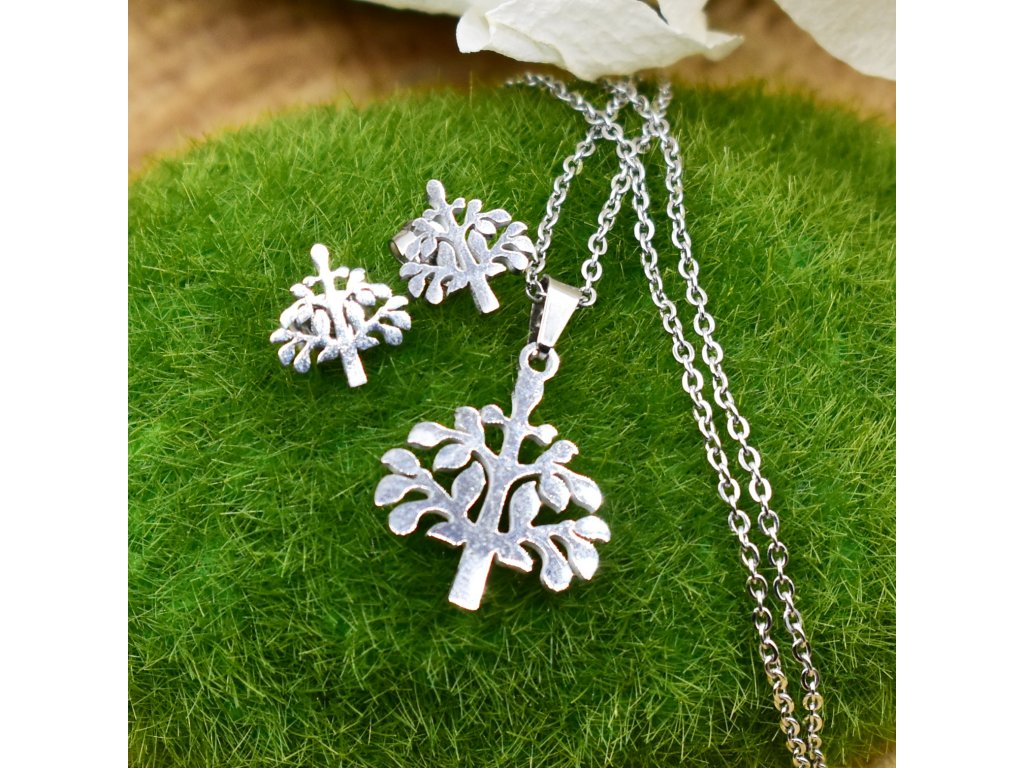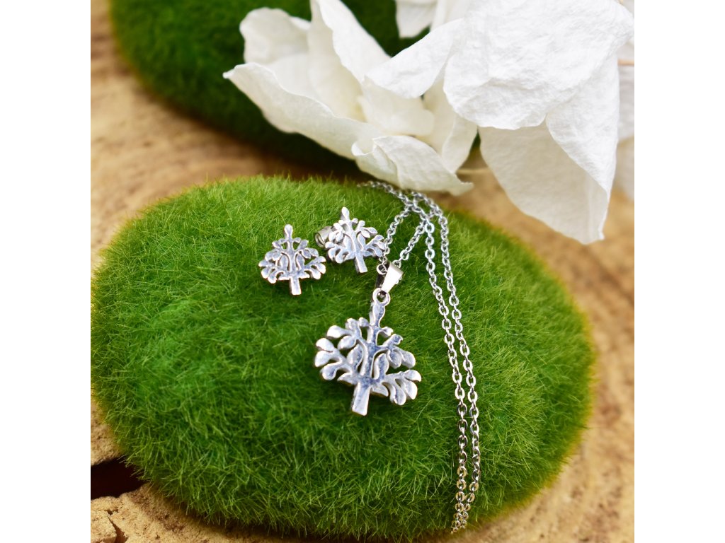 Jednoduché elegantní náušnice a řetízek s přívěškem se symbolem stromu života. Náušnice mají zapínání na puzetku, řetízek je s karabinkou.