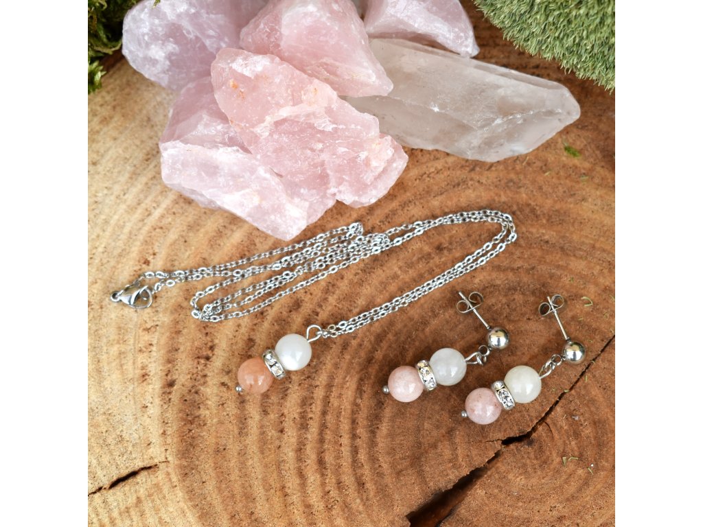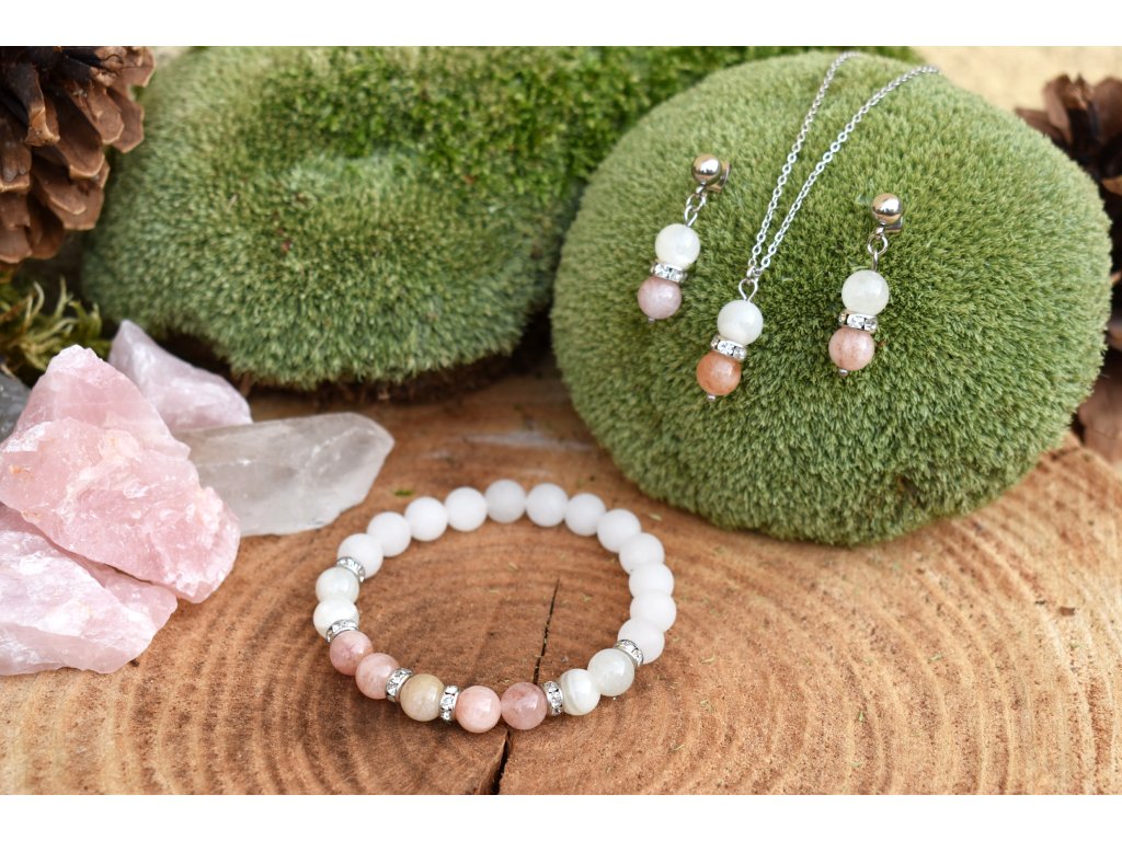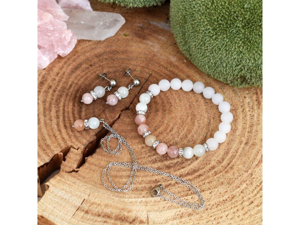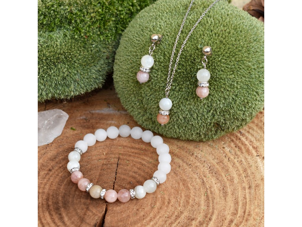 Tato ručně vyráběná souprava šperků z naší dílničky z drahých kamenů broskvového morganitu, bílého měsíčního kamene a matného bílého nefritu je ochranným amuletem lásky, sebelásky a partnerských vztahů. Dodává nám odvahu k projevům romantické i vášnivé lásky a vytváří prostor potřebný k tomu, abychom si skutečně mohli užívat partnerského života. Aktivuje a pročišťuje srdeční čakru, do života plného stresu přináší uklidnění a blahodárně působí na naši duševní rovnováhu a harmonii. Tento účinný amulet vás upozorní na dosud přehlížené potřeby duše, pomáhá rozpoznávat nenaplněné citové potřeby a nevyjádřené emoce. Skvěle funguje při zahánění negativních pocitů, myšlenek a energií. Zlepšuje komunikaci mezi partnery, posiluje ženskou energii a udržuje ji v rovnováze s tou mužskou.