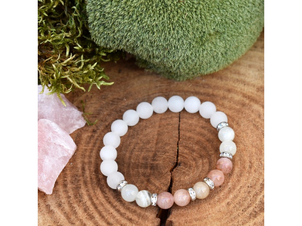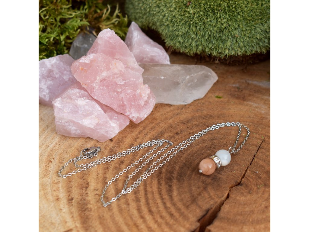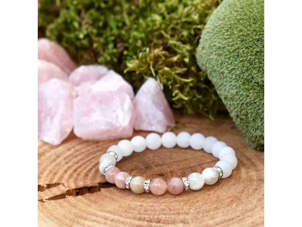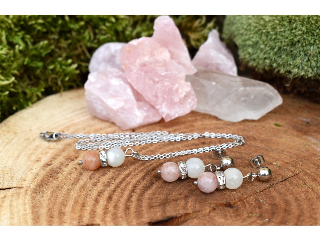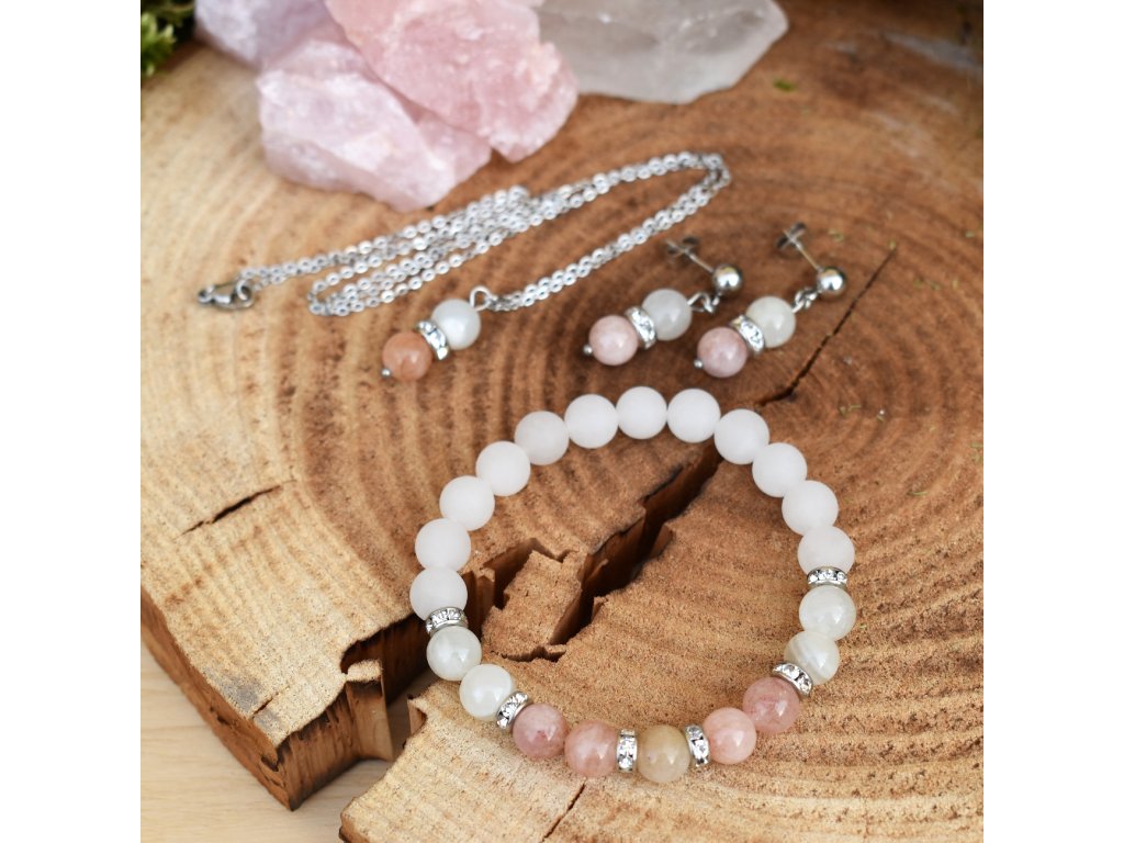 Tato ručně vyráběná souprava šperků z naší dílničky z drahých kamenů broskvového morganitu, bílého měsíčního kamene a matného bílého nefritu je ochranným amuletem lásky, sebelásky a partnerských vztahů. Dodává nám odvahu k projevům romantické i vášnivé lásky a vytváří prostor potřebný k tomu, abychom si skutečně mohli užívat partnerského života. Aktivuje a pročišťuje srdeční čakru, do života plného stresu přináší uklidnění a blahodárně působí na naši duševní rovnováhu a harmonii. Tento účinný amulet vás upozorní na dosud přehlížené potřeby duše, pomáhá rozpoznávat nenaplněné citové potřeby a nevyjádřené emoce. Skvěle funguje při zahánění negativních pocitů, myšlenek a energií. Zlepšuje komunikaci mezi partnery, posiluje ženskou energii a udržuje ji v rovnováze s tou mužskou.