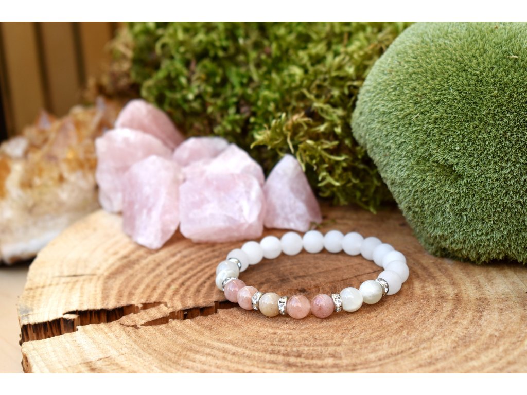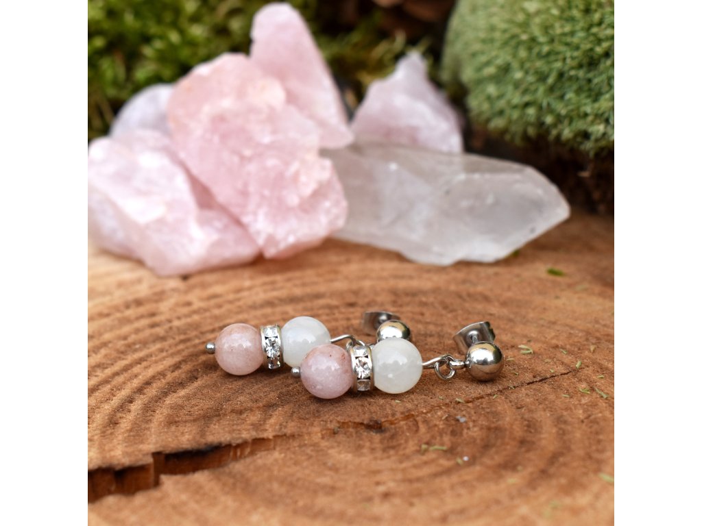 Souprava z minerálů OCHRÁNCE LÁSKY – morganit, bílý měsíční kámen, bílý nefrit, chirurgická ocel