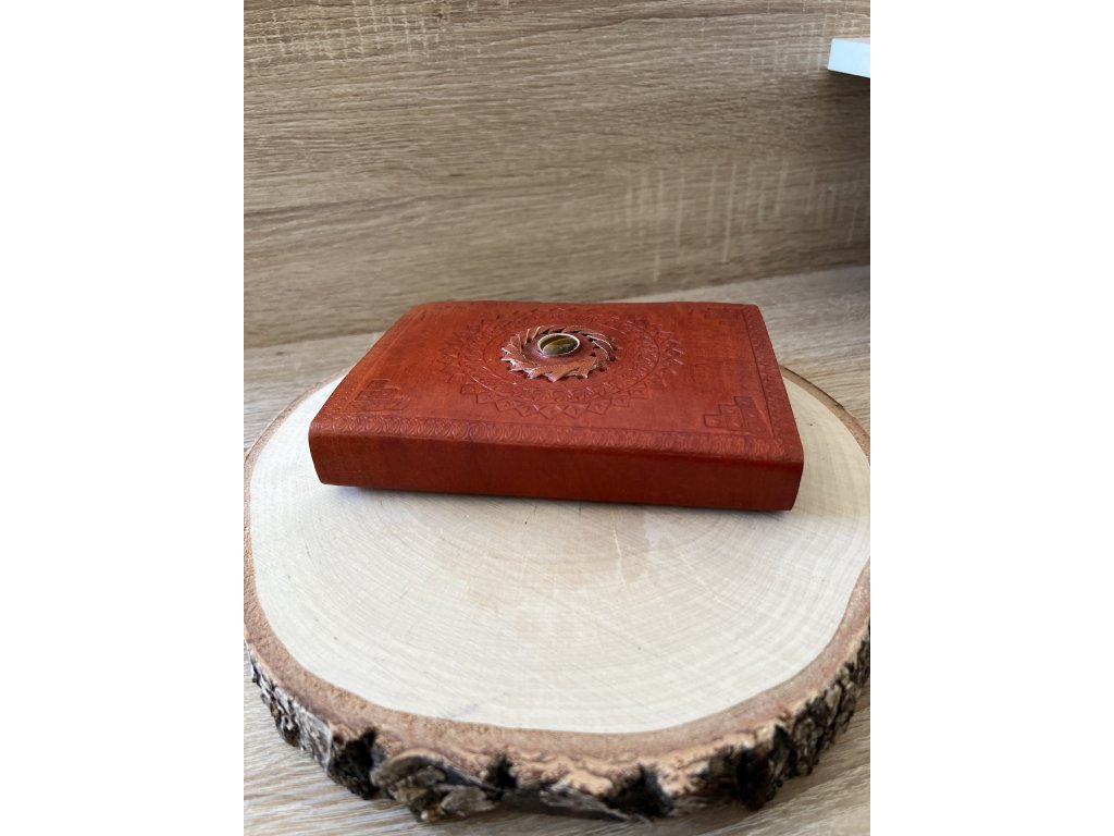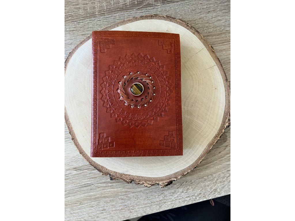 Jedinečný kožený zápisník ve formátu A5, který se stane tvým společníkem na cestě psaní i tvoření. Desky zdobí detailní ražba mandaly a uprostřed je vsazeno tygří oko – kámen odvahy, ochrany a vnitřní stability. Uvnitř najdeš linkované listy, ideální pro každodenní zápisky, plány, sny i kreativní nápady.
